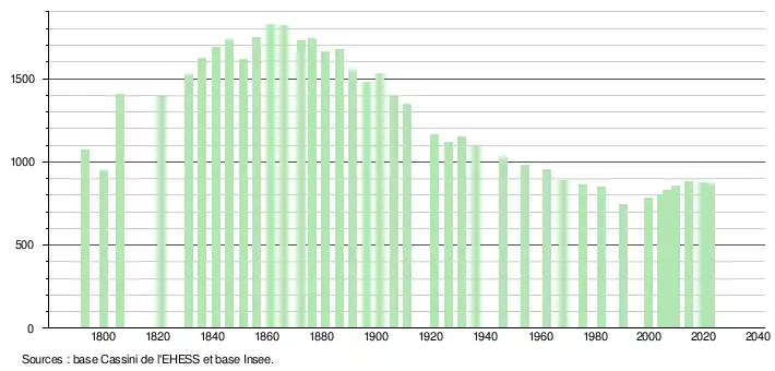 L'évolution du nombre d'habitants est connue à travers les recensements de la population effectués dans la commune depuis 1793. Pour les communes de moins de 10 000 habitants, une enquête de recensement portant sur toute la population est réalisée tous les cinq ans, les populations de référence des années intermédiaires étant quant à elles estimées par interpolation ou extrapolation[26]. Pour la commune, le premier recensement exhaustif entrant dans le cadre du nouveau dispositif a été réalisé en 2004[27].