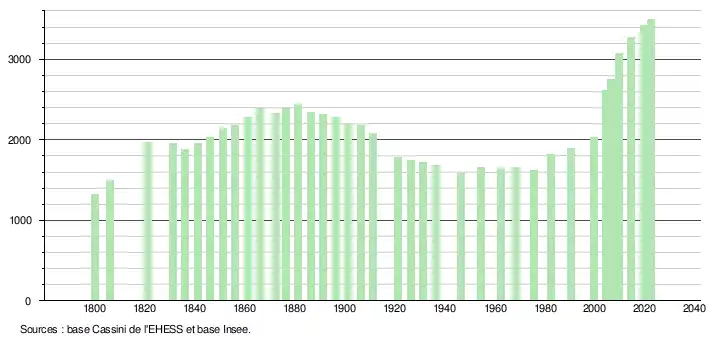 L'évolution du nombre d'habitants est connue à travers les recensements de la population effectués dans la commune depuis 1800. Pour les communes de moins de 10 000 habitants, une enquête de recensement portant sur toute la population est réalisée tous les cinq ans, les populations de référence des années intermédiaires étant quant à elles estimées par interpolation ou extrapolation[31]. Pour la commune, le premier recensement exhaustif entrant dans le cadre du nouveau dispositif a été réalisé en 2004[32].