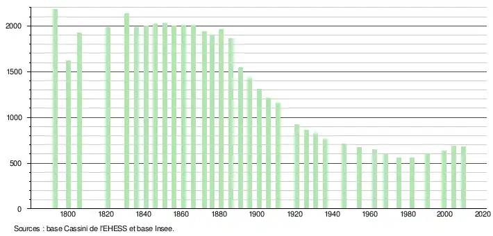 - ↑ Dans le tableau des recensements et le graphique, par convention dans Wikipédia, le principe a été retenu, pour les populations légales postérieures à 1999 de n’afficher dans le tableau des recensements et le graphique que les populations correspondant à l'année 2006, première population légale publiée calculée conformément aux concepts définis dans le décret no 2003-485 du 5 juin 2003, et les années correspondant à une enquête exhaustive de recensement pour les communes de moins de 10 000 habitants, ainsi que la dernière population légale publiée par l’Insee.