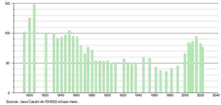 L'évolution du nombre d'habitants est connue à travers les recensements de la population effectués dans la commune depuis 1793. Pour les communes de moins de 10 000 habitants, une enquête de recensement portant sur toute la population est réalisée tous les cinq ans, les populations de référence des années intermédiaires étant quant à elles estimées par interpolation ou extrapolation[19]. Pour la commune, le premier recensement exhaustif entrant dans le cadre du nouveau dispositif a été réalisé en 2004[20].