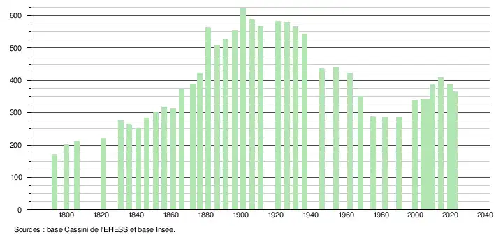 L'évolution du nombre d'habitants est connue à travers les recensements de la population effectués dans la commune depuis 1793. Pour les communes de moins de 10 000 habitants, une enquête de recensement portant sur toute la population est réalisée tous les cinq ans, les populations de référence des années intermédiaires étant quant à elles estimées par interpolation ou extrapolation[26]. Pour la commune, le premier recensement exhaustif entrant dans le cadre du nouveau dispositif a été réalisé en 2004[27].