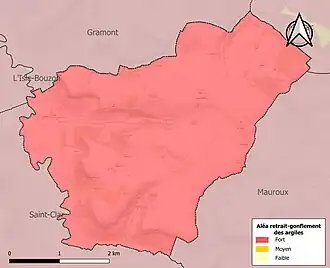 Le retrait-gonflement des sols argileux est susceptible d'engendrer des dommages importants aux bâtiments en cas d’alternance de périodes de sécheresse et de pluie. La totalité de la commune est en aléa moyen ou fort (94,5 % au niveau départemental et 48,5 % au niveau national). Sur les 68 bâtiments dénombrés sur la commune en 2019, 68 sont en aléa moyen ou fort, soit 100 %, à comparer aux 93 % au niveau départemental et 54 % au niveau national. Une cartographie de l'exposition du territoire national au retrait gonflement des sols argileux est disponible sur le site du BRGM[18],[Carte 3].
