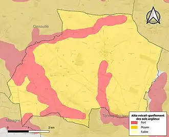Le retrait-gonflement des sols argileux est susceptible d'engendrer des dommages importants aux bâtiments en cas d’alternance de périodes de sécheresse et de pluie. 99,9 % de la superficie communale est en aléa moyen ou fort (54,2 % au niveau départemental et 48,5 % au niveau national). Sur les 169 bâtiments dénombrés sur la commune en 2019, 169 sont en aléa moyen ou fort, soit 100 %, à comparer aux 57 % au niveau départemental et 54 % au niveau national. Une cartographie de l'exposition du territoire national au retrait gonflement des sols argileux est disponible sur le site du BRGM[11],[Carte 2].