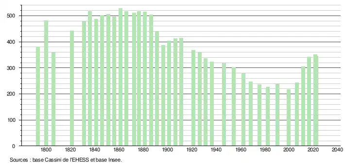 L'évolution du nombre d'habitants est connue à travers les recensements de la population effectués dans la commune depuis 1793. Pour les communes de moins de 10 000 habitants, une enquête de recensement portant sur toute la population est réalisée tous les cinq ans, les populations de référence des années intermédiaires étant quant à elles estimées par interpolation ou extrapolation[15]. Pour la commune, le premier recensement exhaustif entrant dans le cadre du nouveau dispositif a été réalisé en 2006[16].