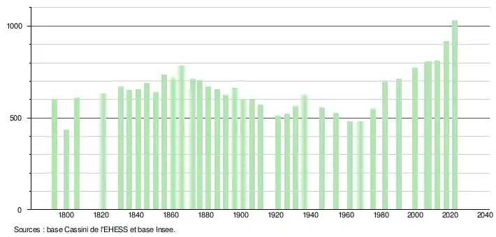 L'évolution du nombre d'habitants est connue à travers les recensements de la population effectués dans la commune depuis 1793. Pour les communes de moins de 10 000 habitants, une enquête de recensement portant sur toute la population est réalisée tous les cinq ans, les populations de référence des années intermédiaires étant quant à elles estimées par interpolation ou extrapolation[14]. Pour la commune, le premier recensement exhaustif entrant dans le cadre du nouveau dispositif a été réalisé en 2007[15].