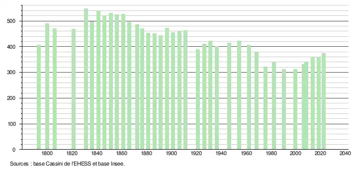 L'évolution du nombre d'habitants est connue à travers les recensements de la population effectués dans la commune depuis 1793. Pour les communes de moins de 10 000 habitants, une enquête de recensement portant sur toute la population est réalisée tous les cinq ans, les populations de référence des années intermédiaires étant quant à elles estimées par interpolation ou extrapolation[19]. Pour la commune, le premier recensement exhaustif entrant dans le cadre du nouveau dispositif a été réalisé en 2008[20].