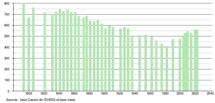 L'évolution du nombre d'habitants est connue à travers les recensements de la population effectués dans la commune depuis 1793. Pour les communes de moins de 10 000 habitants, une enquête de recensement portant sur toute la population est réalisée tous les cinq ans, les populations de référence des années intermédiaires étant quant à elles estimées par interpolation ou extrapolation[16]. Pour la commune, le premier recensement exhaustif entrant dans le cadre du nouveau dispositif a été réalisé en 2004[17].