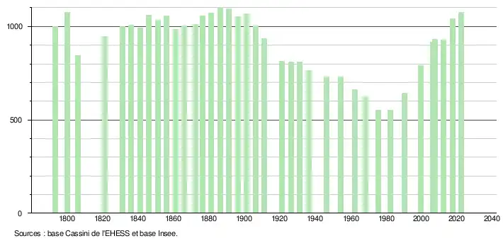 L'évolution du nombre d'habitants est connue à travers les recensements de la population effectués dans la commune depuis 1793. Pour les communes de moins de 10 000 habitants, une enquête de recensement portant sur toute la population est réalisée tous les cinq ans, les populations de référence des années intermédiaires étant quant à elles estimées par interpolation ou extrapolation[13]. Pour la commune, le premier recensement exhaustif entrant dans le cadre du nouveau dispositif a été réalisé en 2007[14].