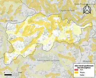 Le retrait-gonflement des sols argileux est susceptible d'engendrer des dommages importants aux bâtiments en cas d’alternance de périodes de sécheresse et de pluie[15]. 37,5 % de la superficie communale est en aléa moyen ou fort (27 % au niveau départemental et 48,5 % au niveau national métropolitain)[Carte 2]. Depuis le , en application de la loi ÉLAN, différentes contraintes s'imposent aux vendeurs, maîtres d'ouvrages ou constructeurs de biens situés dans une zone classée en aléa moyen ou fort[Note 2],[16].