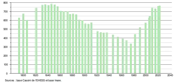 L'évolution du nombre d'habitants est connue à travers les recensements de la population effectués dans la commune depuis 1793. Pour les communes de moins de 10 000 habitants, une enquête de recensement portant sur toute la population est réalisée tous les cinq ans, les populations de référence des années intermédiaires étant quant à elles estimées par interpolation ou extrapolation[15]. Pour la commune, le premier recensement exhaustif entrant dans le cadre du nouveau dispositif a été réalisé en 2005[16].