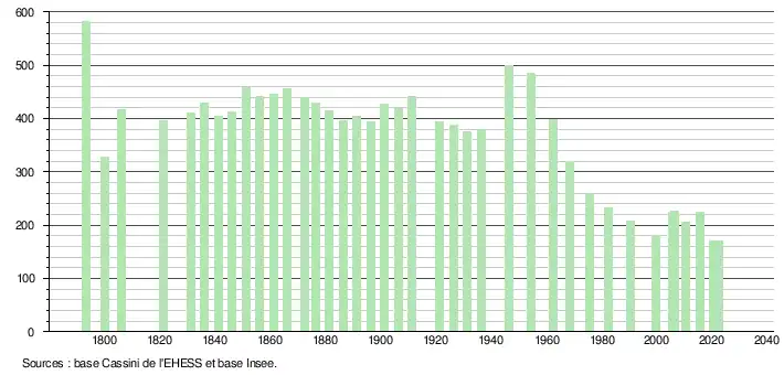 L'évolution du nombre d'habitants est connue à travers les recensements de la population effectués dans la commune depuis 1793. Pour les communes de moins de 10 000 habitants, une enquête de recensement portant sur toute la population est réalisée tous les cinq ans, les populations de référence des années intermédiaires étant quant à elles estimées par interpolation ou extrapolation[29]. Pour la commune, le premier recensement exhaustif entrant dans le cadre du nouveau dispositif a été réalisé en 2005[30].