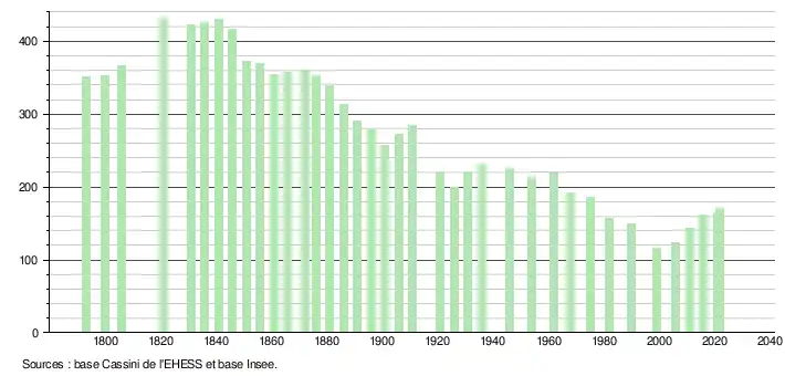 L'évolution du nombre d'habitants est connue à travers les recensements de la population effectués dans la commune depuis 1793. Pour les communes de moins de 10 000 habitants, une enquête de recensement portant sur toute la population est réalisée tous les cinq ans, les populations de référence des années intermédiaires étant quant à elles estimées par interpolation ou extrapolation[28]. Pour la commune, le premier recensement exhaustif entrant dans le cadre du nouveau dispositif a été réalisé en 2006[29].