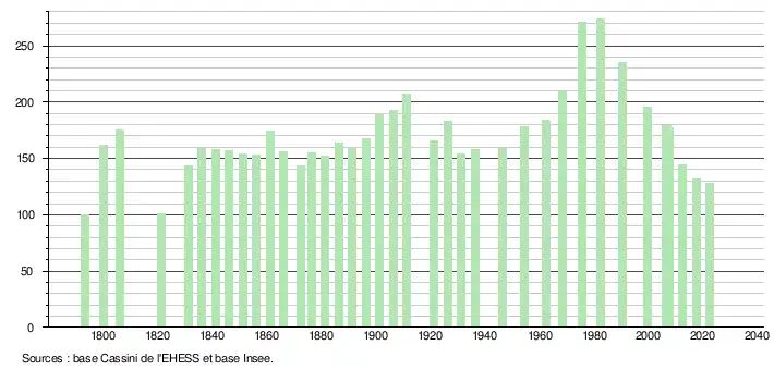 L'évolution du nombre d'habitants est connue à travers les recensements de la population effectués dans la commune depuis 1793. Pour les communes de moins de 10 000 habitants, une enquête de recensement portant sur toute la population est réalisée tous les cinq ans, les populations de référence des années intermédiaires étant quant à elles estimées par interpolation ou extrapolation[26]. Pour la commune, le premier recensement exhaustif entrant dans le cadre du nouveau dispositif a été réalisé en 2007[27].