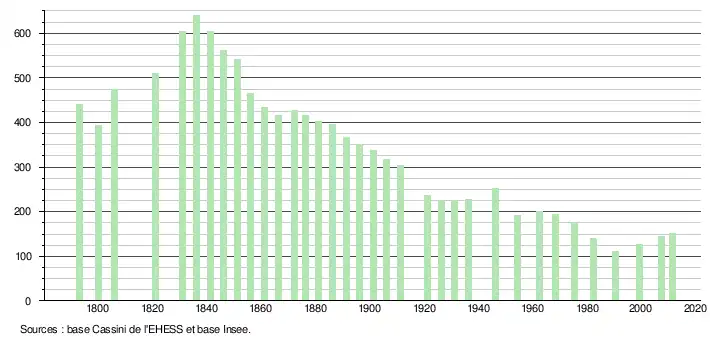 - ↑ Dans le tableau des recensements et le graphique, par convention dans Wikipédia, le principe a été retenu, pour les populations légales postérieures à 1999 de n’afficher dans le tableau des recensements et le graphique que les populations correspondant à l'année 2006, première population légale publiée calculée conformément aux concepts définis dans le décret no 2003-485 du 5 juin 2003, et les années correspondant à une enquête exhaustive de recensement pour les communes de moins de 10 000 habitants, ainsi que la dernière population légale publiée par l’Insee.