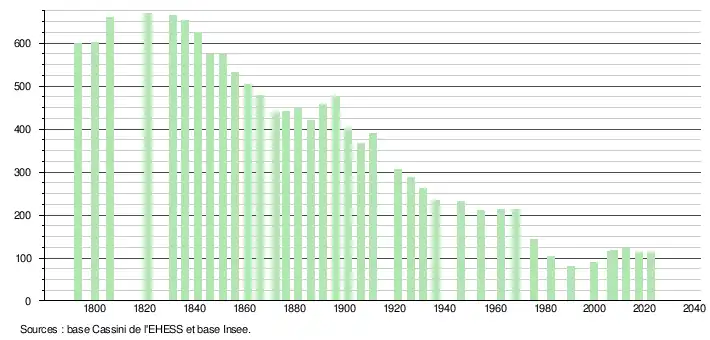 L'évolution du nombre d'habitants est connue à travers les recensements de la population effectués dans la commune depuis 1793. Pour les communes de moins de 10 000 habitants, une enquête de recensement portant sur toute la population est réalisée tous les cinq ans, les populations de référence des années intermédiaires étant quant à elles estimées par interpolation ou extrapolation[18]. Pour la commune, le premier recensement exhaustif entrant dans le cadre du nouveau dispositif a été réalisé en 2007[19].