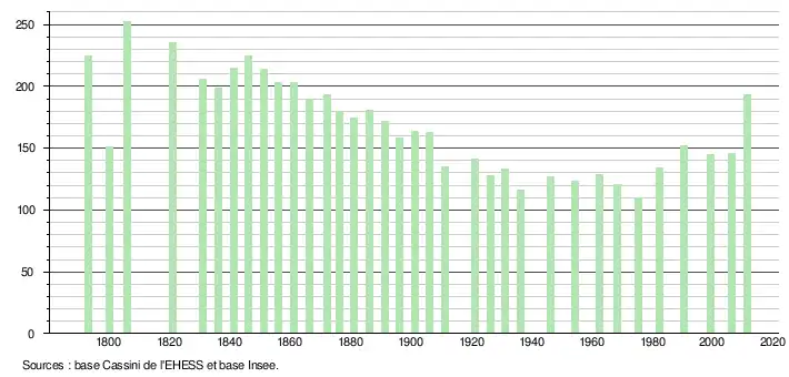 - ↑ Par convention dans Wikipédia, le principe a été retenu de n’afficher dans le tableau des recensements et le graphique, pour les populations légales postérieures à 1999, que les populations correspondant à une enquête exhaustive de recensement pour les communes de moins de 10 000 habitants, et que les populations des années 2006, 2011, 2016, etc. pour les communes de plus de 10 000 habitants, ainsi que la dernière population légale publiée par l’Insee pour l'ensemble des communes.