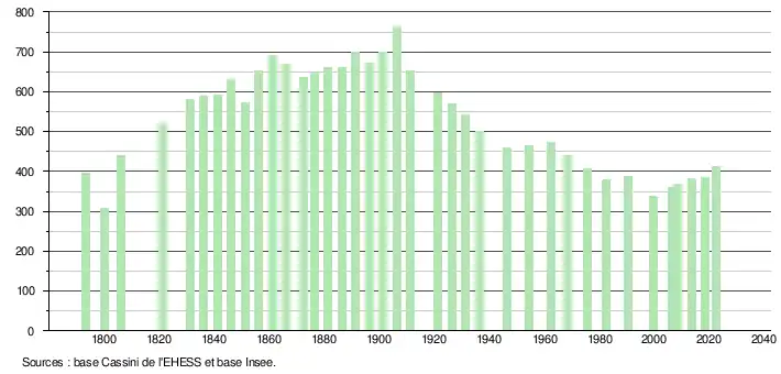 L'évolution du nombre d'habitants est connue à travers les recensements de la population effectués dans la commune depuis 1793. Pour les communes de moins de 10 000 habitants, une enquête de recensement portant sur toute la population est réalisée tous les cinq ans, les populations de référence des années intermédiaires étant quant à elles estimées par interpolation ou extrapolation[15]. Pour la commune, le premier recensement exhaustif entrant dans le cadre du nouveau dispositif a été réalisé en 2008[16].
