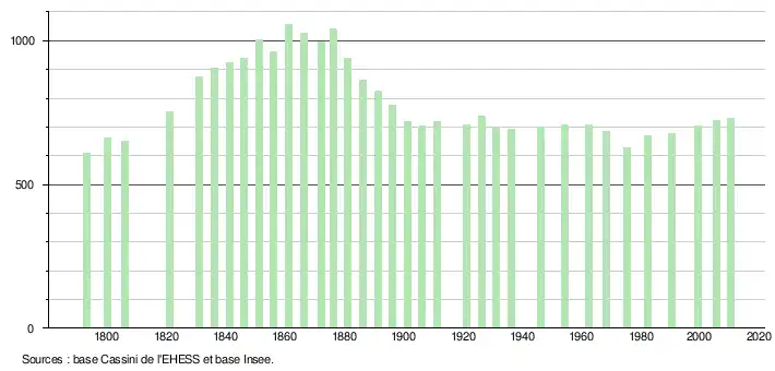 L'évolution du nombre d'habitants est connue à travers les recensements de la population effectués dans la commune depuis 1793. À partir du , les populations légales des communes sont publiées annuellement dans le cadre d'un recensement qui repose désormais sur une collecte d'information annuelle, concernant successivement tous les territoires communaux au cours d'une période de cinq ans. Pour les communes de moins de 10 000 habitants, une enquête de recensement portant sur toute la population est réalisée tous les cinq ans, les populations légales des années intermédiaires étant quant à elles estimées par interpolation ou extrapolation[4]. Pour la commune, le premier recensement exhaustif entrant dans le cadre du nouveau dispositif a été réalisé en 2005[5],[Note 1].