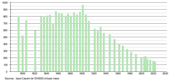 L'évolution du nombre d'habitants est connue à travers les recensements de la population effectués dans la commune depuis 1793. Pour les communes de moins de 10 000 habitants, une enquête de recensement portant sur toute la population est réalisée tous les cinq ans, les populations de référence des années intermédiaires étant quant à elles estimées par interpolation ou extrapolation[21]. Pour la commune, le premier recensement exhaustif entrant dans le cadre du nouveau dispositif a été réalisé en 2004[22].