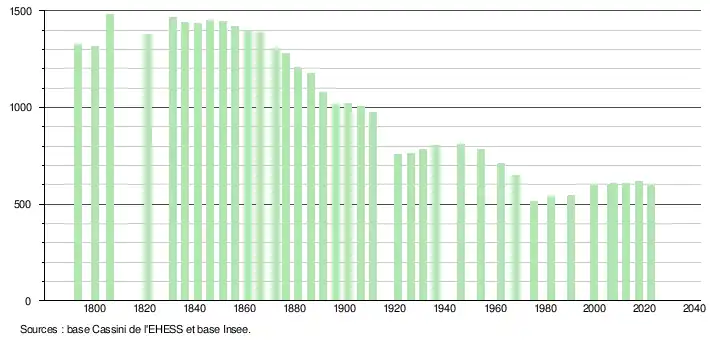 L'évolution du nombre d'habitants est connue à travers les recensements de la population effectués dans la commune depuis 1793. Pour les communes de moins de 10 000 habitants, une enquête de recensement portant sur toute la population est réalisée tous les cinq ans, les populations de référence des années intermédiaires étant quant à elles estimées par interpolation ou extrapolation[31]. Pour la commune, le premier recensement exhaustif entrant dans le cadre du nouveau dispositif a été réalisé en 2007[32].