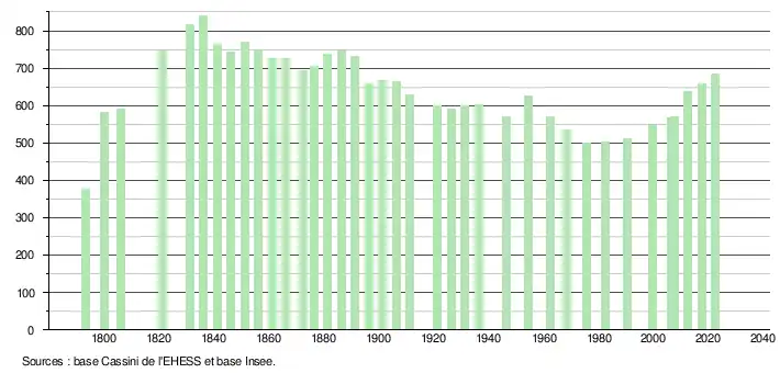 L'évolution du nombre d'habitants est connue à travers les recensements de la population effectués dans la commune depuis 1793. Pour les communes de moins de 10 000 habitants, une enquête de recensement portant sur toute la population est réalisée tous les cinq ans, les populations de référence des années intermédiaires étant quant à elles estimées par interpolation ou extrapolation[13]. Pour la commune, le premier recensement exhaustif entrant dans le cadre du nouveau dispositif a été réalisé en 2007[14].