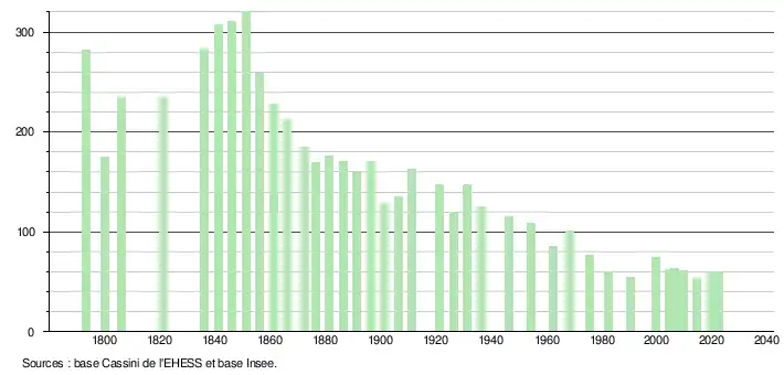 L'évolution du nombre d'habitants est connue à travers les recensements de la population effectués dans la commune depuis 1793. Pour les communes de moins de 10 000 habitants, une enquête de recensement portant sur toute la population est réalisée tous les cinq ans, les populations de référence des années intermédiaires étant quant à elles estimées par interpolation ou extrapolation[24]. Pour la commune, le premier recensement exhaustif entrant dans le cadre du nouveau dispositif a été réalisé en 2004[25].