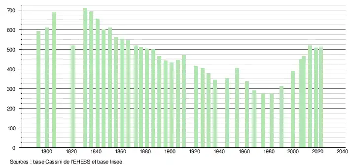 | L'évolution du nombre d'habitants est connue à travers les recensements de la population effectués dans la commune depuis 1793. Pour les communes de moins de 10 000 habitants, une enquête de recensement portant sur toute la population est réalisée tous les cinq ans, les populations de référence des années intermédiaires étant quant à elles estimées par interpolation ou extrapolation[23]. Pour la commune, le premier recensement exhaustif entrant dans le cadre du nouveau dispositif a été réalisé en 2008[24]. En 2022, la commune comptait 511 habitants[Note 4], en évolution de −0,58 % par rapport à 2016 (Aude : +2,65 %, France hors Mayotte : +2,11 %). |