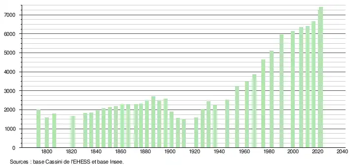 L'évolution du nombre d'habitants est connue à travers les recensements de la population effectués dans la commune depuis 1793. Pour les communes de moins de 10 000 habitants, une enquête de recensement portant sur toute la population est réalisée tous les cinq ans, les populations de référence des années intermédiaires étant quant à elles estimées par interpolation ou extrapolation[22]. Pour la commune, le premier recensement exhaustif entrant dans le cadre du nouveau dispositif a été réalisé en 2006[23].