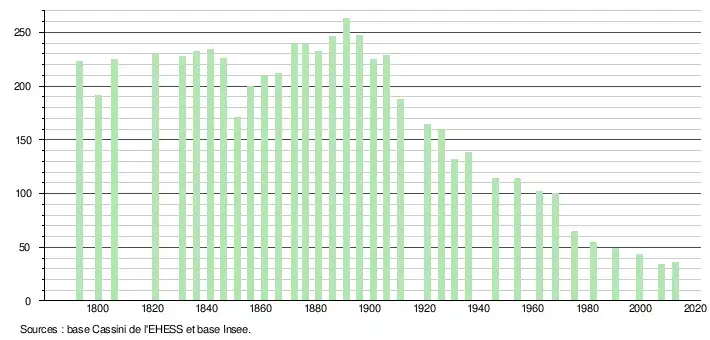 - ↑ Par convention dans Wikipédia, le principe a été retenu de n’afficher dans le tableau des recensements et le graphique, pour les populations légales postérieures à 1999, que les populations correspondant à une enquête exhaustive de recensement pour les communes de moins de 10 000 habitants, et que les populations des années 2006, 2011, 2016, etc. pour les communes de plus de 10 000 habitants, ainsi que la dernière population légale publiée par l’Insee pour l'ensemble des communes.