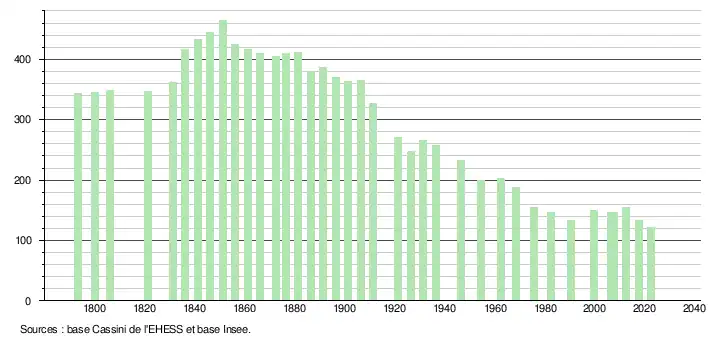 L'évolution du nombre d'habitants est connue à travers les recensements de la population effectués dans la commune depuis 1793. Pour les communes de moins de 10 000 habitants, une enquête de recensement portant sur toute la population est réalisée tous les cinq ans, les populations de référence des années intermédiaires étant quant à elles estimées par interpolation ou extrapolation[17]. Pour la commune, le premier recensement exhaustif entrant dans le cadre du nouveau dispositif a été réalisé en 2007[18].