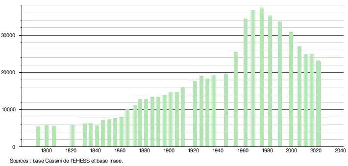 - ↑ Par convention dans Wikipédia, le principe a été retenu de n’afficher dans le tableau des recensements et le graphique, pour les populations de référence postérieures à 1999, que les populations correspondant à une enquête exhaustive de recensement pour les communes de moins de 10 000 habitants, et que les populations des années 2006, 2011, 2016, etc. pour les communes de plus de 10 000 habitants, ainsi que la dernière population de référence publiée par l’Insee pour l'ensemble des communes.