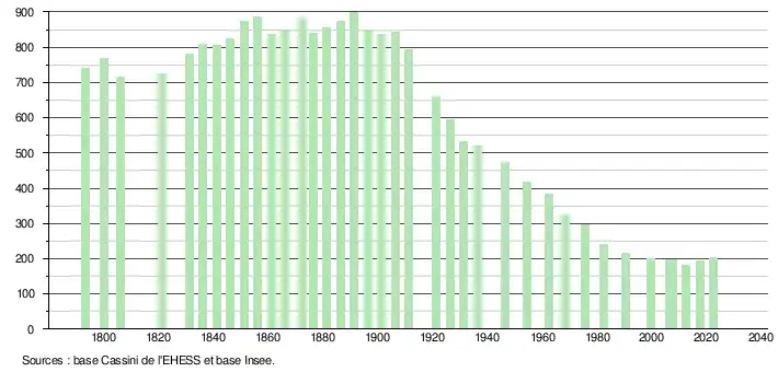 L'évolution du nombre d'habitants est connue à travers les recensements de la population effectués dans la commune depuis 1793. Pour les communes de moins de 10 000 habitants, une enquête de recensement portant sur toute la population est réalisée tous les cinq ans, les populations de référence des années intermédiaires étant quant à elles estimées par interpolation ou extrapolation[21]. Pour la commune, le premier recensement exhaustif entrant dans le cadre du nouveau dispositif a été réalisé en 2007[22].