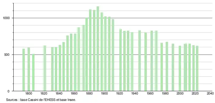 L'évolution du nombre d'habitants est connue à travers les recensements de la population effectués dans la commune depuis 1793. Pour les communes de moins de 10 000 habitants, une enquête de recensement portant sur toute la population est réalisée tous les cinq ans, les populations de référence des années intermédiaires étant quant à elles estimées par interpolation ou extrapolation[15]. Pour la commune, le premier recensement exhaustif entrant dans le cadre du nouveau dispositif a été réalisé en 2007[16].