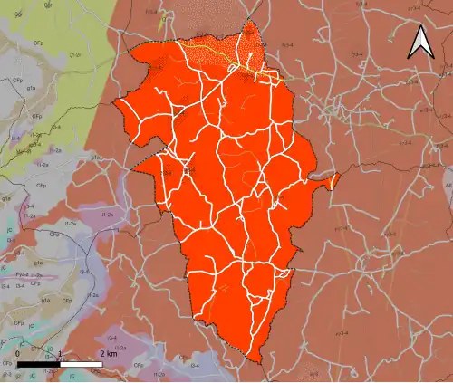 L'occupation des sols de la commune, telle qu'elle ressort de la base de données européenne d’occupation biophysique des sols Corine Land Cover (CLC), est marquée par l'importance des forêts et milieux semi-naturels (52,9 % en 2018), une proportion sensiblement équivalente à celle de 1990 (52,5 %). La répartition détaillée en 2018 est la suivante : forêts (52,9 %), zones agricoles hétérogènes (34,9 %), prairies (5,6 %), eaux continentales[Note 4] (3,9 %), zones urbanisées (2,6 %)[36]. L'évolution de l’occupation des sols de la commune et de ses infrastructures peut être observée sur les différentes représentations cartographiques du territoire : la carte de Cassini (XVIIIe siècle), la carte d'état-major (1820-1866) et les cartes ou photos aériennes de l'IGN pour la période actuelle (1950 à aujourd'hui)[Carte 3].
