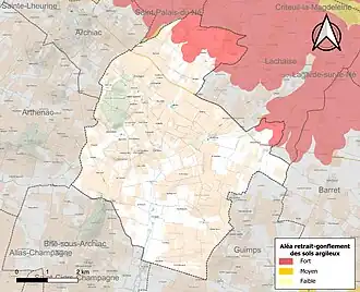 Le retrait-gonflement des sols argileux est susceptible d'engendrer des dommages importants aux bâtiments en cas d’alternance de périodes de sécheresse et de pluie. 8,6 % de la superficie communale est en aléa moyen ou fort (54,2 % au niveau départemental et 48,5 % au niveau national). Sur les 161 bâtiments dénombrés sur la commune en 2019, 10 sont en aléa moyen ou fort, soit 6 %, à comparer aux 57 % au niveau départemental et 54 % au niveau national. Une cartographie de l'exposition du territoire national au retrait gonflement des sols argileux est disponible sur le site du BRGM[11],[Carte 2].