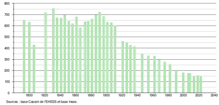 L'évolution du nombre d'habitants est connue à travers les recensements de la population effectués dans la commune depuis 1793. Pour les communes de moins de 10 000 habitants, une enquête de recensement portant sur toute la population est réalisée tous les cinq ans, les populations de référence des années intermédiaires étant quant à elles estimées par interpolation ou extrapolation[16]. Pour la commune, le premier recensement exhaustif entrant dans le cadre du nouveau dispositif a été réalisé en 2008[17].