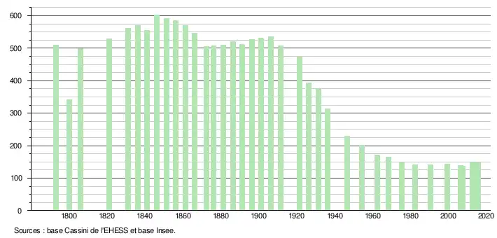 L'évolution du nombre d'habitants est connue à travers les recensements de la population effectués dans la commune depuis 1793. Pour les communes de moins de 10 000 habitants, une enquête de recensement portant sur toute la population est réalisée tous les cinq ans, les populations de référence des années intermédiaires étant quant à elles estimées par interpolation ou extrapolation[3]. Pour la commune, le premier recensement exhaustif entrant dans le cadre du nouveau dispositif a été réalisé en 2007[4].