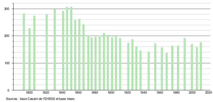 - ↑ Par convention dans Wikipédia, le principe a été retenu de n’afficher dans le tableau des recensements et le graphique, pour les populations légales postérieures à 1999, que les populations correspondant à une enquête exhaustive de recensement pour les communes de moins de 10 000 habitants, et que les populations des années 2006, 2011, 2016, etc. pour les communes de plus de 10 000 habitants, ainsi que la dernière population légale publiée par l’Insee pour l'ensemble des communes.