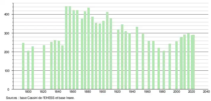 L'évolution du nombre d'habitants est connue à travers les recensements de la population effectués dans la commune depuis 1793. Pour les communes de moins de 10 000 habitants, une enquête de recensement portant sur toute la population est réalisée tous les cinq ans, les populations de référence des années intermédiaires étant quant à elles estimées par interpolation ou extrapolation[21]. Pour la commune, le premier recensement exhaustif entrant dans le cadre du nouveau dispositif a été réalisé en 2005[22].