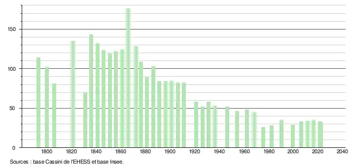 L'évolution du nombre d'habitants est connue à travers les recensements de la population effectués dans la commune depuis 1793. Pour les communes de moins de 10 000 habitants, une enquête de recensement portant sur toute la population est réalisée tous les cinq ans, les populations de référence des années intermédiaires étant quant à elles estimées par interpolation ou extrapolation[28]. Pour la commune, le premier recensement exhaustif entrant dans le cadre du nouveau dispositif a été réalisé en 2006[29].