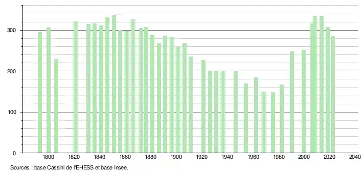 L'évolution du nombre d'habitants est connue à travers les recensements de la population effectués dans la commune depuis 1793. Pour les communes de moins de 10 000 habitants, une enquête de recensement portant sur toute la population est réalisée tous les cinq ans, les populations de référence des années intermédiaires étant quant à elles estimées par interpolation ou extrapolation[24]. Pour la commune, le premier recensement exhaustif entrant dans le cadre du nouveau dispositif a été réalisé en 2008[25].