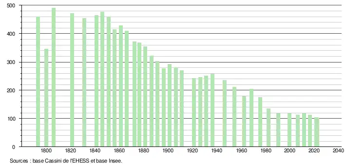 L'évolution du nombre d'habitants est connue à travers les recensements de la population effectués dans la commune depuis 1793. Pour les communes de moins de 10 000 habitants, une enquête de recensement portant sur toute la population est réalisée tous les cinq ans, les populations de référence des années intermédiaires étant quant à elles estimées par interpolation ou extrapolation[26]. Pour la commune, le premier recensement exhaustif entrant dans le cadre du nouveau dispositif a été réalisé en 2006[27].