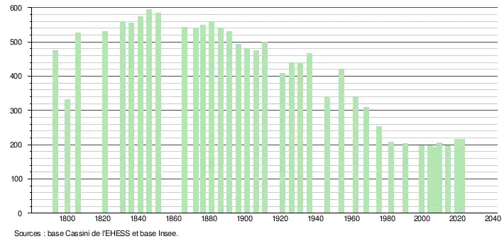 L'évolution du nombre d'habitants est connue à travers les recensements de la population effectués dans la commune depuis 1793. Pour les communes de moins de 10 000 habitants, une enquête de recensement portant sur toute la population est réalisée tous les cinq ans, les populations de référence des années intermédiaires étant quant à elles estimées par interpolation ou extrapolation[19]. Pour la commune, le premier recensement exhaustif entrant dans le cadre du nouveau dispositif a été réalisé en 2004[20].