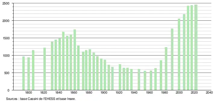 L'évolution du nombre d'habitants est connue à travers les recensements de la population effectués dans la commune depuis 1793. Pour les communes de moins de 10 000 habitants, une enquête de recensement portant sur toute la population est réalisée tous les cinq ans, les populations de référence des années intermédiaires étant quant à elles estimées par interpolation ou extrapolation[20]. Pour la commune, le premier recensement exhaustif entrant dans le cadre du nouveau dispositif a été réalisé en 2006[21].