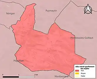 Le retrait-gonflement des sols argileux est susceptible d'engendrer des dommages importants aux bâtiments en cas d’alternance de périodes de sécheresse et de pluie. La totalité de la commune est en aléa moyen ou fort (88,8 % au niveau départemental et 48,5 % au niveau national). Sur les 35 bâtiments dénombrés sur la commune en 2019, 35 sont en aléa moyen ou fort, soit 100 %, à comparer aux 98 % au niveau départemental et 54 % au niveau national. Une cartographie de l'exposition du territoire national au retrait gonflement des sols argileux est disponible sur le site du BRGM[23],[Carte 3].