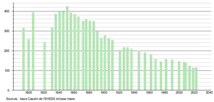 L'évolution du nombre d'habitants est connue à travers les recensements de la population effectués dans la commune depuis 1793. Pour les communes de moins de 10 000 habitants, une enquête de recensement portant sur toute la population est réalisée tous les cinq ans, les populations de référence des années intermédiaires étant quant à elles estimées par interpolation ou extrapolation[26]. Pour la commune, le premier recensement exhaustif entrant dans le cadre du nouveau dispositif a été réalisé en 2008[27].