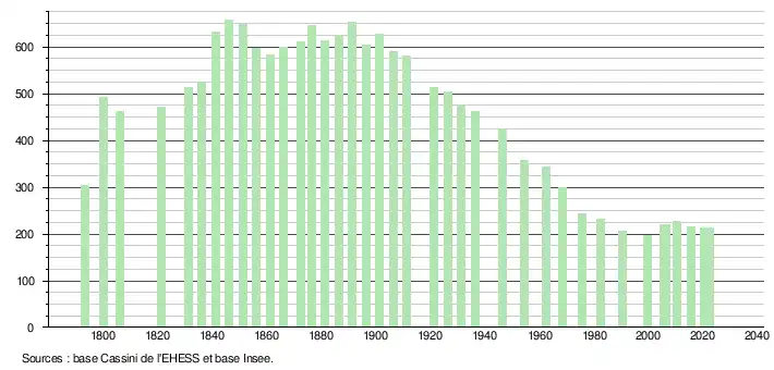 L'évolution du nombre d'habitants est connue à travers les recensements de la population effectués dans la commune depuis 1793. Pour les communes de moins de 10 000 habitants, une enquête de recensement portant sur toute la population est réalisée tous les cinq ans, les populations de référence des années intermédiaires étant quant à elles estimées par interpolation ou extrapolation[22]. Pour la commune, le premier recensement exhaustif entrant dans le cadre du nouveau dispositif a été réalisé en 2005[23].