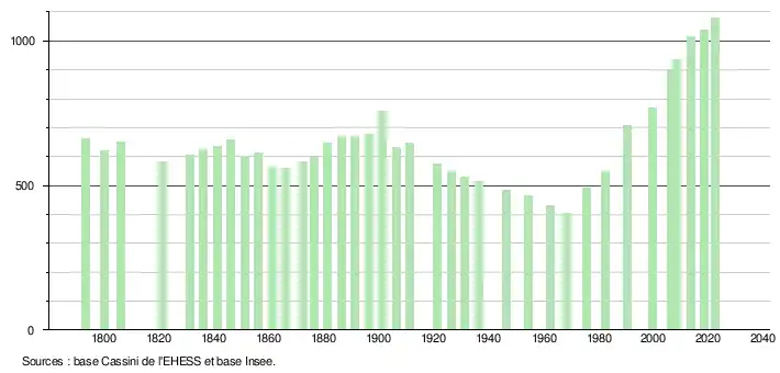 L'évolution du nombre d'habitants est connue à travers les recensements de la population effectués dans la commune depuis 1793. Pour les communes de moins de 10 000 habitants, une enquête de recensement portant sur toute la population est réalisée tous les cinq ans, les populations de référence des années intermédiaires étant quant à elles estimées par interpolation ou extrapolation[29]. Pour la commune, le premier recensement exhaustif entrant dans le cadre du nouveau dispositif a été réalisé en 2008[30].