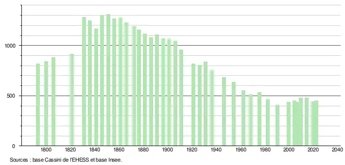 L'évolution du nombre d'habitants est connue à travers les recensements de la population effectués dans la commune depuis 1793. Pour les communes de moins de 10 000 habitants, une enquête de recensement portant sur toute la population est réalisée tous les cinq ans, les populations de référence des années intermédiaires étant quant à elles estimées par interpolation ou extrapolation[19]. Pour la commune, le premier recensement exhaustif entrant dans le cadre du nouveau dispositif a été réalisé en 2004[20].