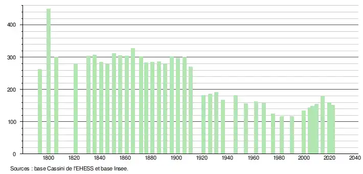 L'évolution du nombre d'habitants est connue à travers les recensements de la population effectués dans la commune depuis 1793. Pour les communes de moins de 10 000 habitants, une enquête de recensement portant sur toute la population est réalisée tous les cinq ans, les populations de référence des années intermédiaires étant quant à elles estimées par interpolation ou extrapolation[14]. Pour la commune, le premier recensement exhaustif entrant dans le cadre du nouveau dispositif a été réalisé en 2004[15].